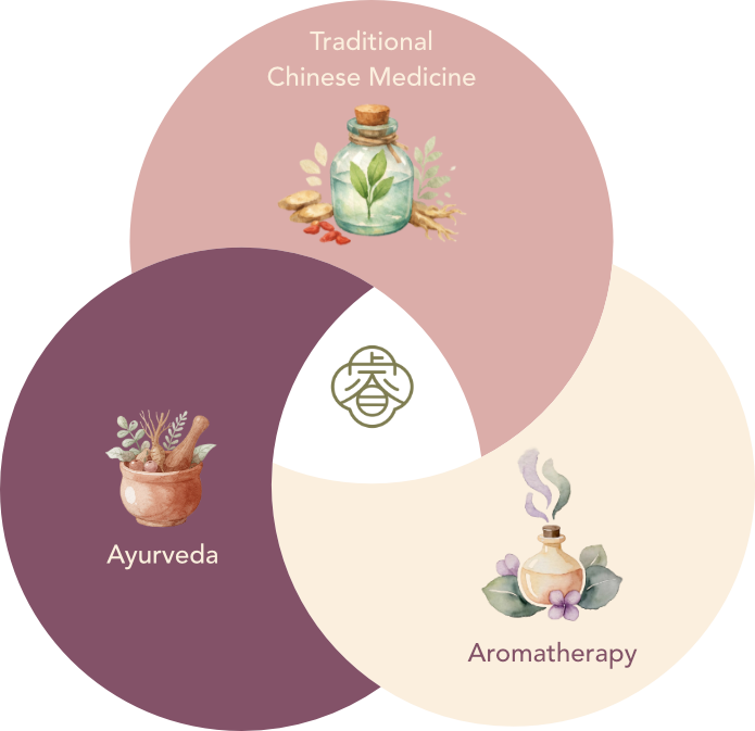 传统中医、阿育吠陀和芳香疗法是三种古老的整体疗愈体系,几个世纪以来一直被用于促进身、心、灵的健康与平衡。它们结合起来,效果远大于各部分之和。在中医中,芳香疗法可以增强针灸或按摩的疗效;在阿育吠陀中,芳香疗法可以平衡三脉(doshas),并在冥想或瑜伽练习中促进放松。